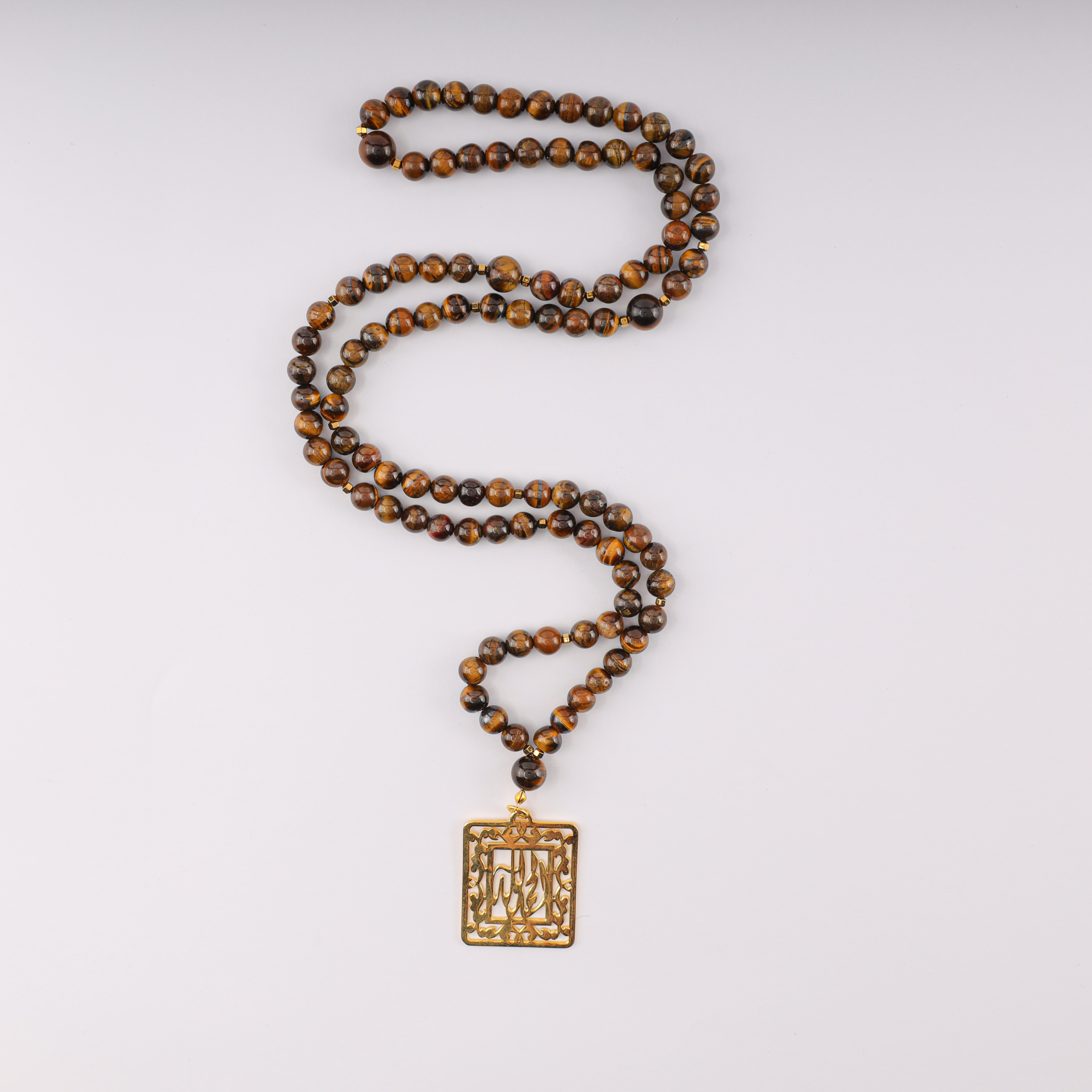 سبحة تايجر آي طبيعي 100 حبة بمقاس 8 مللي مع فواصل هيماتيت ذهبي ودلاية نحاس مطلي ذهب، تعزز الثقة بالنفس، الحماية، وتحويل الطاقة السلبية إلى إيجابية.
